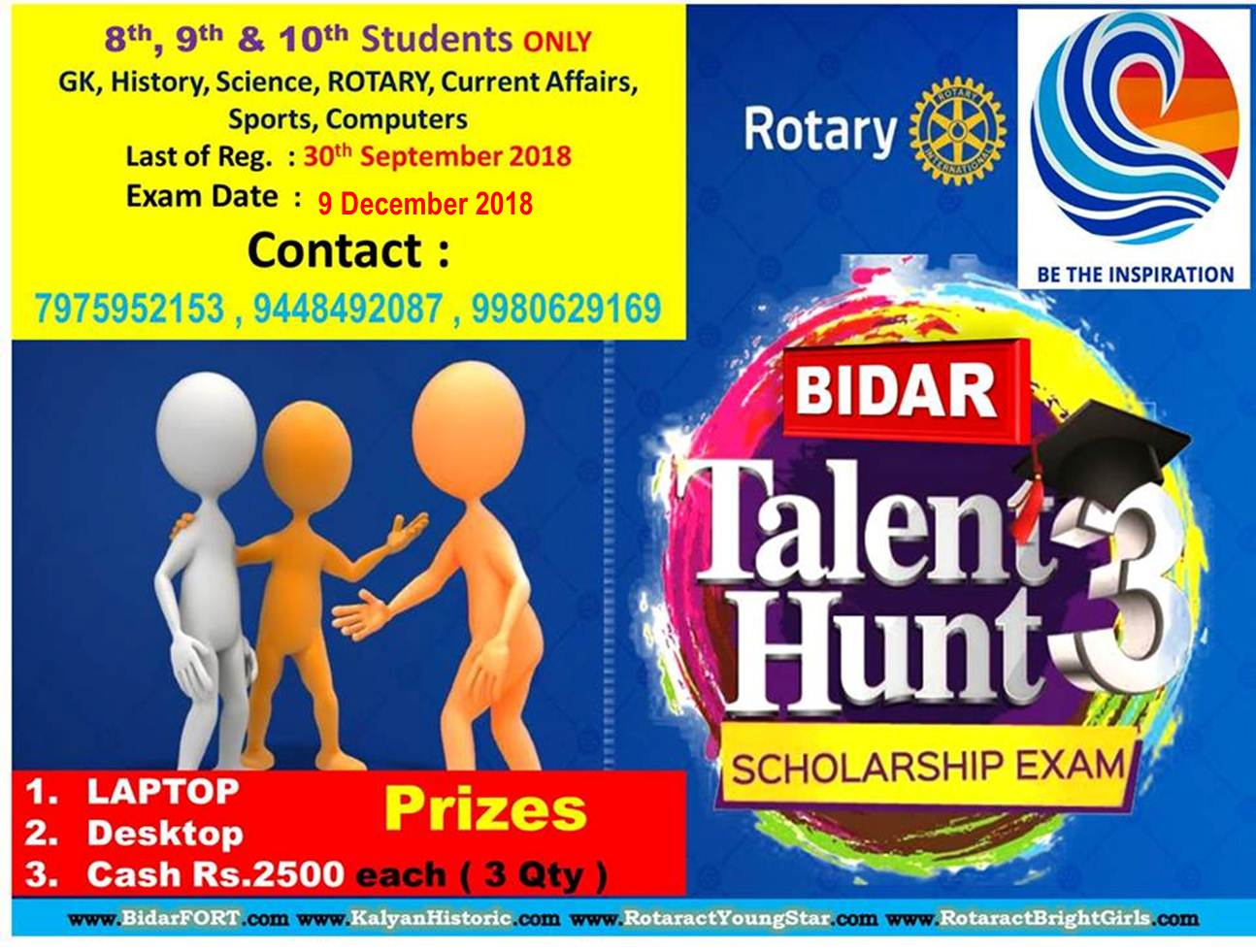 Details: ROTARY TALENT HUNT EXAMINATION held on on 09-12-2018 Organised by : Rotary club Bidar Fort - 51115 , Kalyan historic Satellite Club, Rotaract YoungSTAR, Rotaract Bright Girls, Bidar, Conducted Rotary Dist -3160 Dist event Rotary Talent Hunt Exams for High school students (8th,9th,10th) nearly 400 in bidar. After exams participation certificates were given to all students. After valuation of papers it is planed to top 5 students were awarded with cash prizes and appreciation certificates. Our club president Zaheer Anwar, Secretary myself, and Vivek Patne, Vinay Biradar, P. Siddappa, Godhe Gundapa, Mallikarjun Chelva, S.B. Chitta, Donald Johnson, Kashinath Patil, Rajkumar Joldapke, Vinod Kalekar, Shruti Uppe, and other members Of all Clubs helps in conducting successful exams. Thanks to all college principals and students participated in this historic event. Thanks one and all. #BidarFORT www.BidarFORT.com #KalyanHistoric www.KalyanHistoric.com #RotaractBidar www.RotaractYoungStar.com #RotaractGirls www.RotaractBrightGirls.com